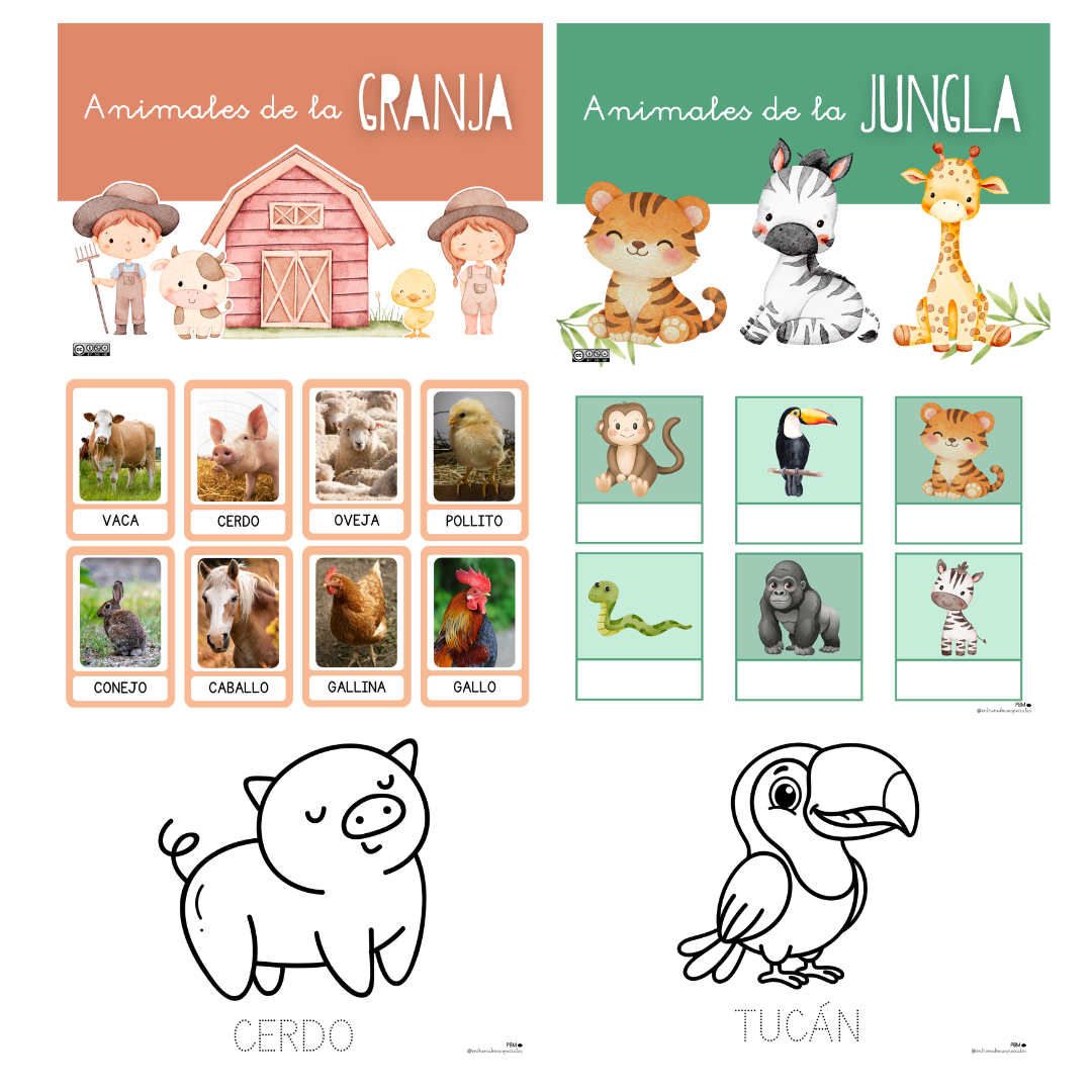 Un PDF imprimible con actividades para que los más pequeños conozcan y trabajen los animales de la granja y la jungla de forma lúdica y educativa.
